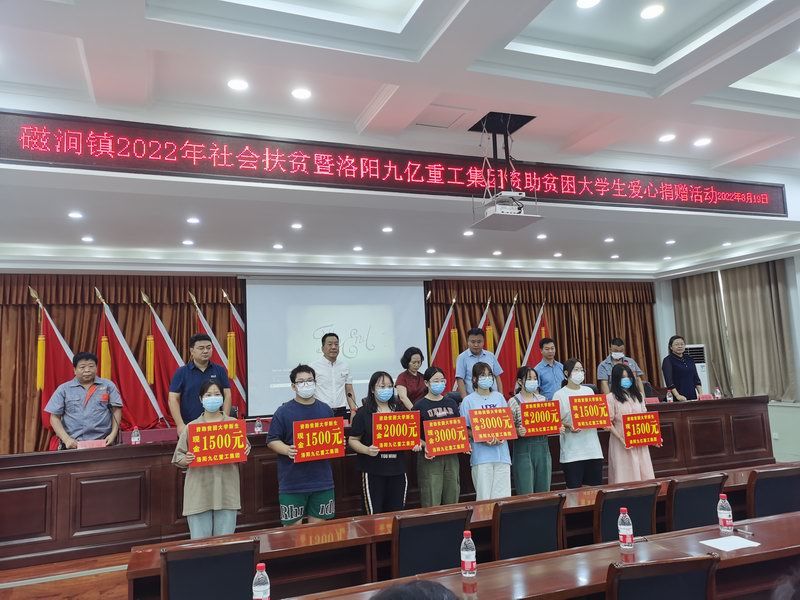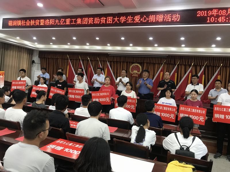愛是與生俱來的,在血液里流動,在骨子里結晶,它源源不斷的由心而生,永不枯竭,只要人人都愿意奉獻一點愛,就如甘霖沐浴大地,人間處處盛開幸福之花! 為響應洛陽市政府精準扶貧政策,洛陽九億重工集團有限公司及董事長王九茂積極參與捐資助學的慈善義舉活動,特做出如下決定:1、公司幫扶磁澗鎮(zhèn)2017年新招貧困大學生21名順利入學,每人資助2000元,總計肆萬貳仟元整; 2、總經理王九茂(縣政協(xié)委員)以個人名義資助磁澗鎮(zhèn)南窯村2017年新招大學生6名,總計12000元整; 我相信,在社會各界的大力支持和共同努力下,我們的“愛心助學”活動將會惠及到更多的同學,為了夢想,刻苦讀書、報銷祖國,廣大同學也一定會在溫暖的社會大家庭里茁壯成長,必將成為國家建設的有用之才! 洛陽九億重工集團有限公司 董事長:王九茂